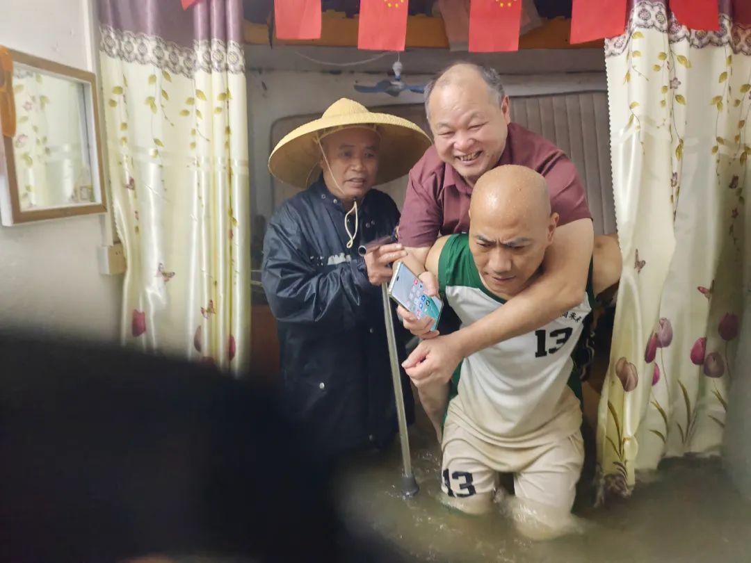8月5日凌晨,暴雨红色预警拉响,玉堂围社区瞬间被洪水侵袭。来不及换雨具,梁伟杰就冲向瓦房集中的低洼地带。浑浊的积水没过大腿,他深一脚浅一脚挨家排查,背起行动不便的老人,搀扶起儿童,成功转移20名群众,其中包括3名儿童、2名残疾人和2名孤寡老人。