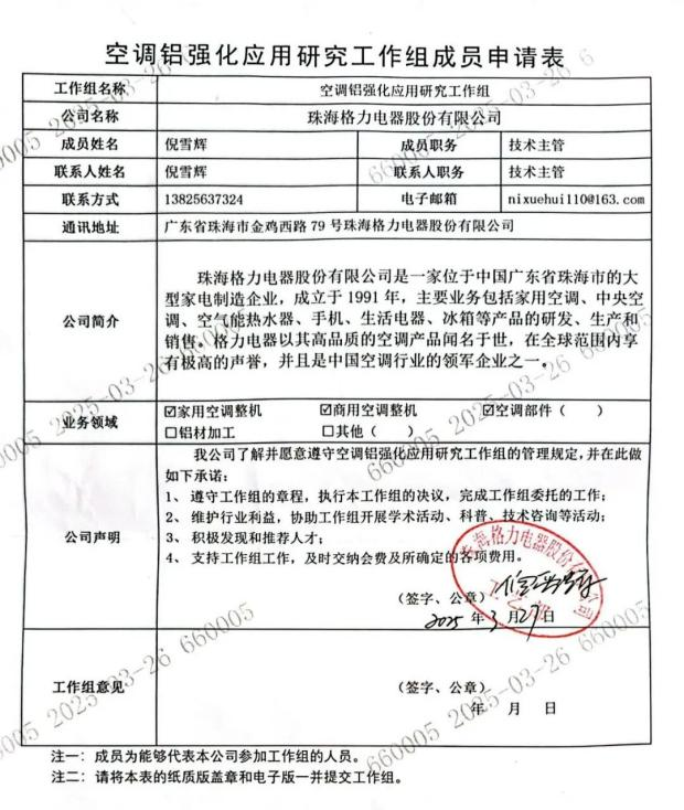 接着,海信空调一方迅速作出回应。4月15日,海信空调空气事业部品牌总监杨祥玺不仅回怼格力“真铜实料”并非格力首创,还直接甩出一份格力电器有限公司的《空调铝强化应用研究工作组成员申请表》扫描件。其中显示,去年3月27日,格力曾主动申请加入“铝代铜”工作组。